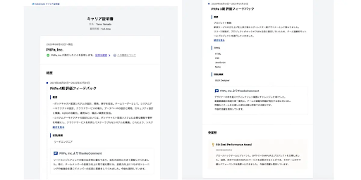 所属企業名 / 雇用形態 / 所属期間 / 業務内容(概要と詳細) / 役割とチーム規模 / 使用言語(スキル) / 企業からの「Thanks Comment」(推薦コメントや定性評価) / 受賞歴 等