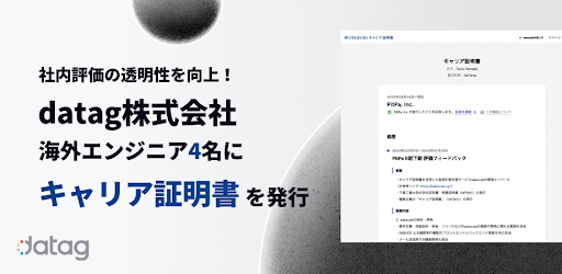 datag株式会社(本社:東京都目黒区 代表取締役CEO:小林 孝嗣、以下「datag」)は、在籍中の海外エンジニア4名に対し、入社時から約半年の職歴と実績を記載した「キャリア証明書」を発行いたしました。