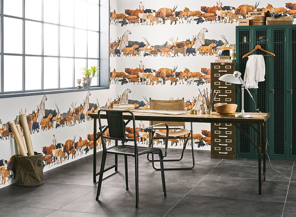 ヨーロッパバイソン、アフリカスイギュウなどの陸上動物のはく製の写真を使い、動物たちが行進しているような楽しいレイアウトの壁紙です。博物館の「地球館」3 階では100 頭を超える動物のはく製が圧倒的な迫力を放っており、それをリアルに再現しました。
