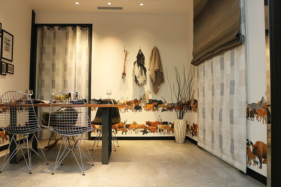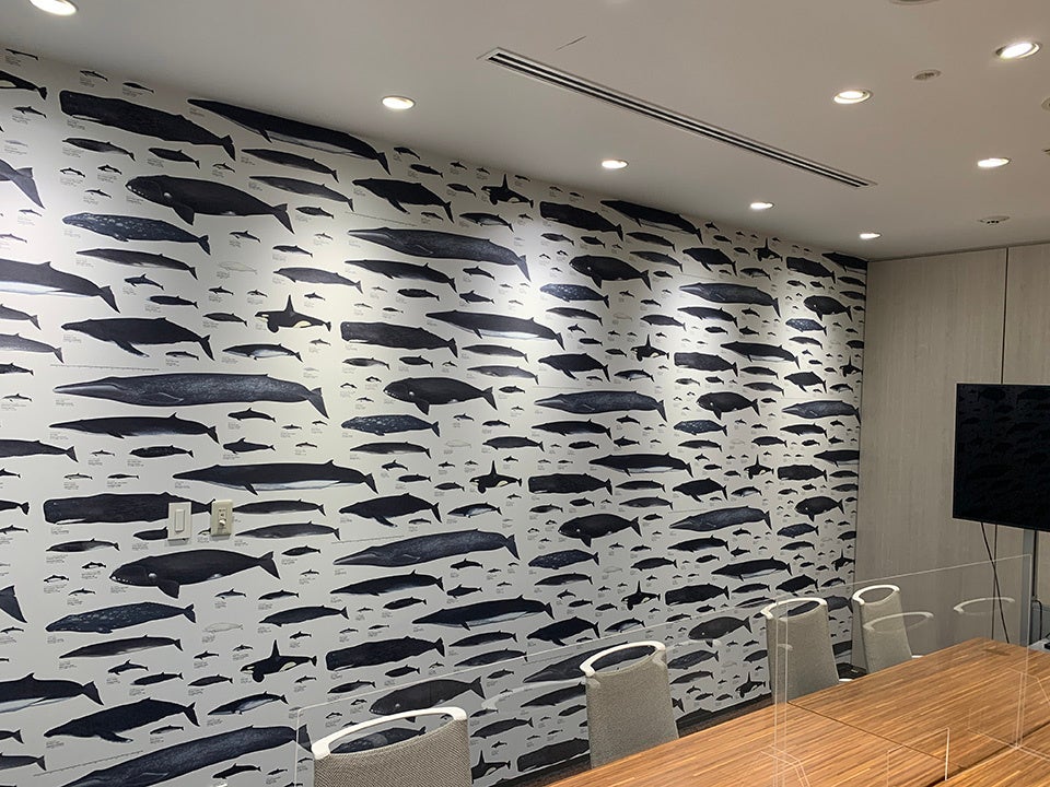 当社の名古屋ショールーム内モデルルームには「BEASTS」を、品川ショールーム内セミナールームには「WHALES AND DOLPHINS」を施工しています。名古屋ショールームでは、大胆で印象的なダイニングルームをコーディネート。グレイッシュカラーを基調としてスタイリッシュな空間に仕立て、大自然と都会を融合させた個性的な空間に仕上げました。