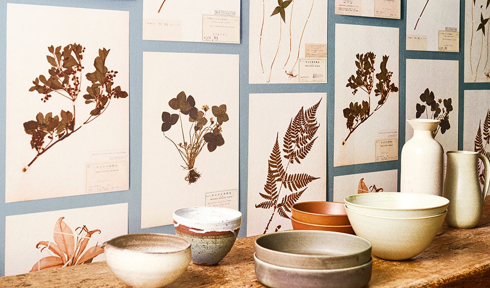 明治時代から収集されている、おし葉標本コレクションから、形がユニークなものを厳選して表しました。植物名はもちろん、採取された地名や日付のラベルもそのまま表示されており、一般には公開されていない貴重な標本を、デザインとして楽しむことができます。