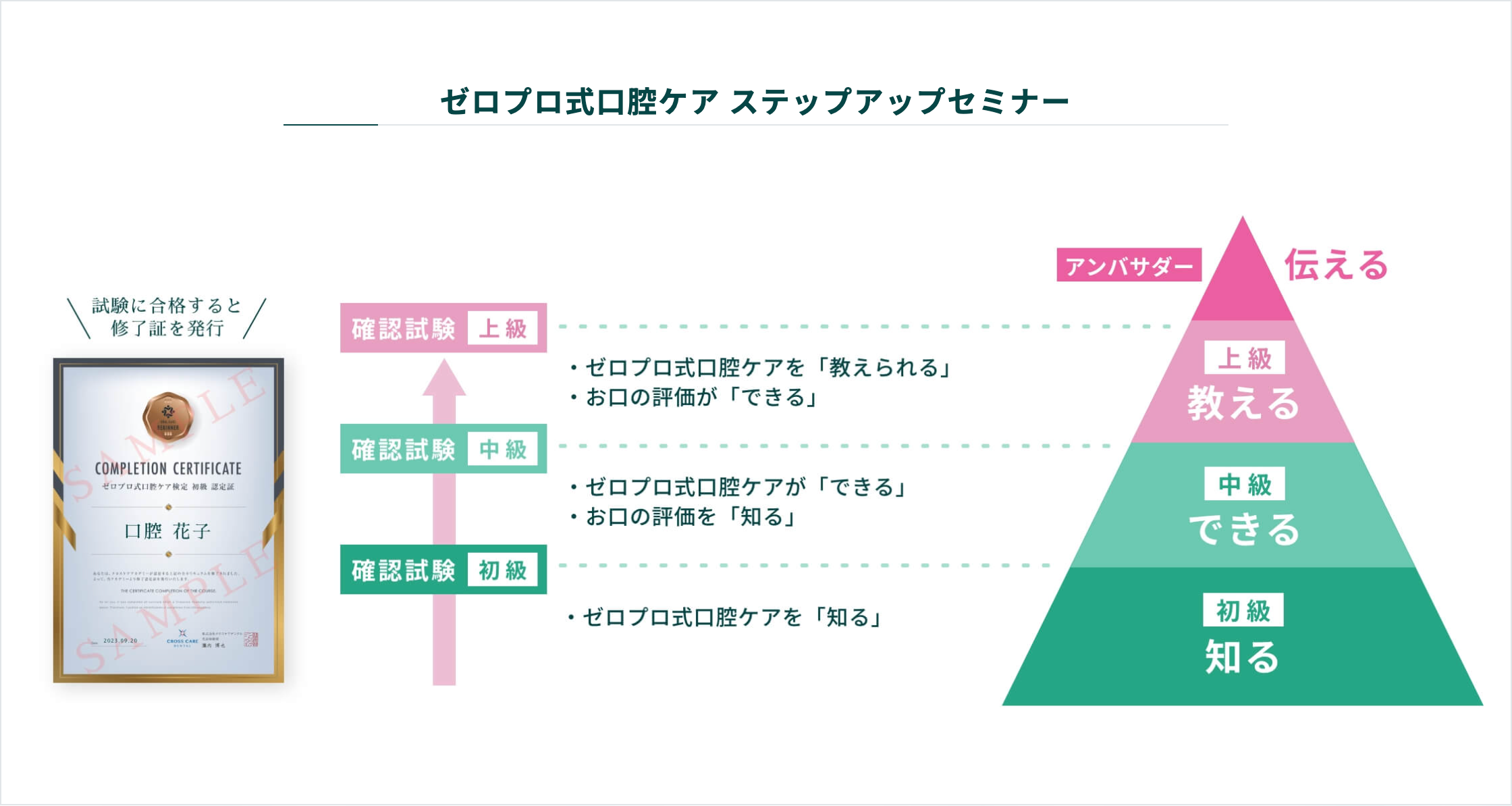 誤嚥性肺炎ゼロプロジェクト(以下ゼロプロ)(注1)を通して、肺炎を防ぐ介護の口腔ケア(ゼロプロ式口腔ケア)を週2回実施することで、全国の介護施設における誤嚥性肺炎を予防してきました。但し、ゼロプロでは介護施設単位での参加が必要なため、在宅介護や個人の方が学べる機会が限られていました。そこで、本講座では、個人単位での介護の口腔ケアの技術の習得や研鑽ができる門戸を開きます。講座だけでなく検定(図2)も受検頂くことで、介護の口腔ケアの実践的スペシャリストとして専門性を獲得することができます。