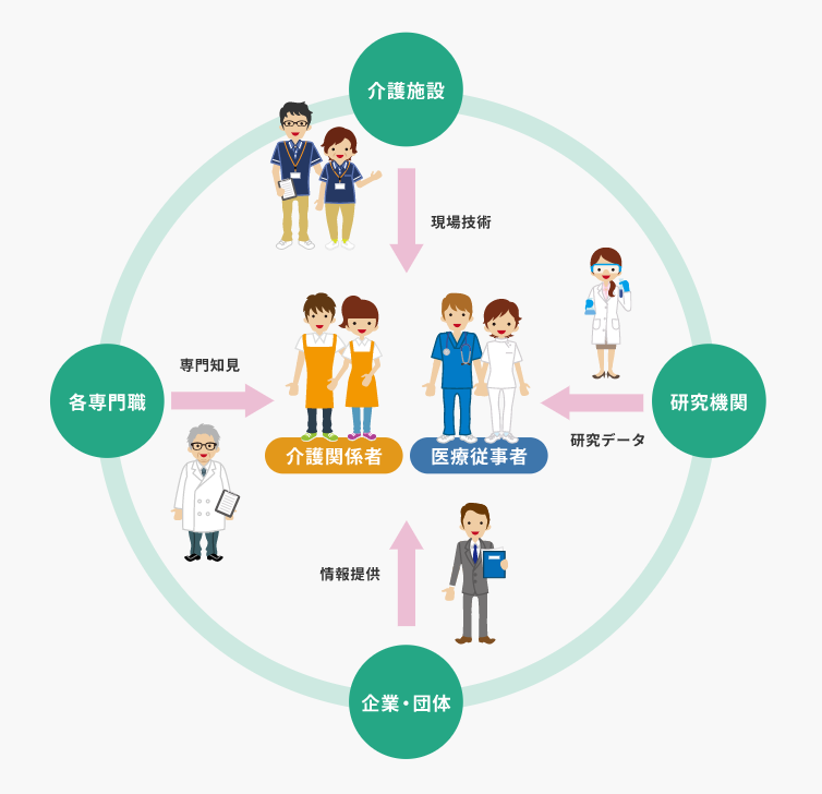 在宅で介護に携わっている人や介護の現場で働く方々、医療従事者の皆さまが気軽に参加できる「介護に関わるすべての人を応援する学びのネットワーク」(図1)です。介護事業所、各専門職、企業・団体、研究機関等が協力し、様々な視点から「介護のチカラで命を守る」ために必要な、介護現場で求められる実践的な技術や知識を学べる場を提供して参ります。