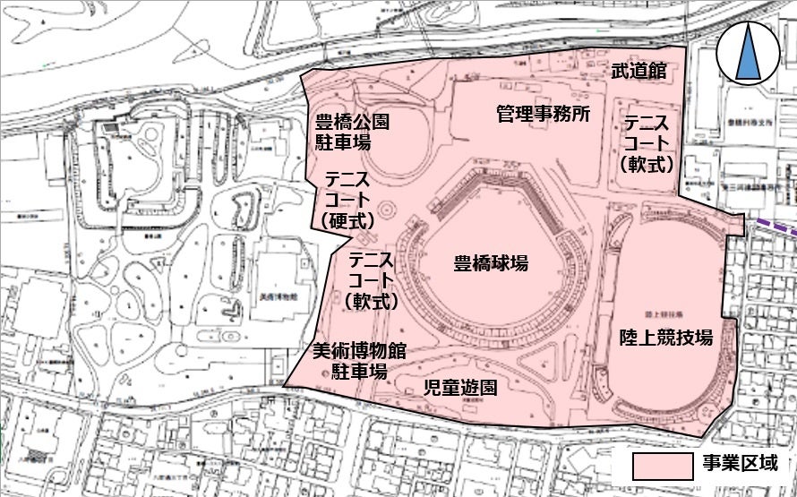 事業区域となる「豊橋公園東側エリア」において、多目的屋内施設の新設及び公園施設の再整備を行うとともに、事業区域内の施設の一体的な管理・運営を行うものです。