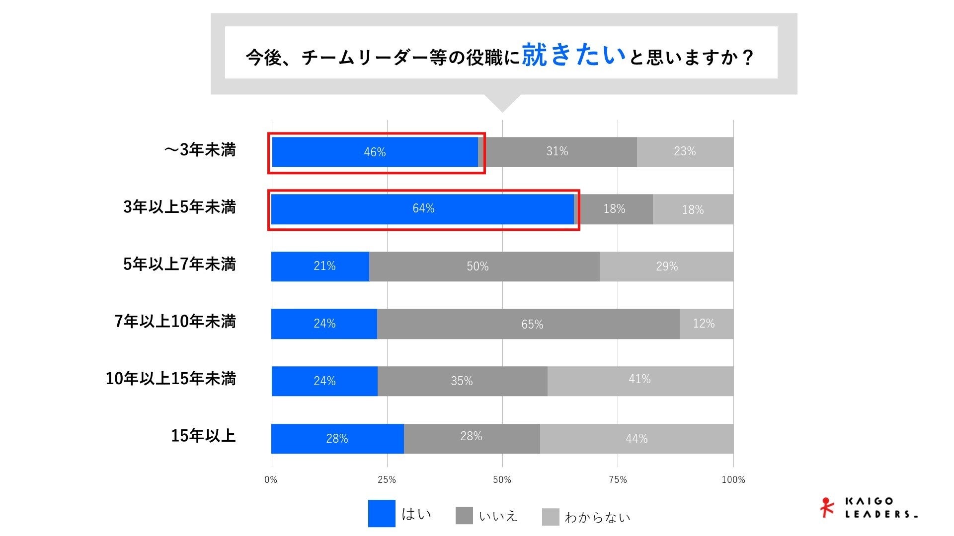 - 介護・福祉分野での勤務年数別「リーダー職への昇進意欲」