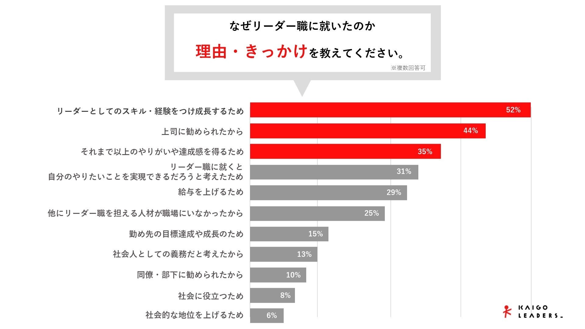 - リーダー職に就いた理由・きっかけ 1位「リーダーとしてのスキル・経験をつけ成長するため」52%、2位「上司に勧められたから」44%