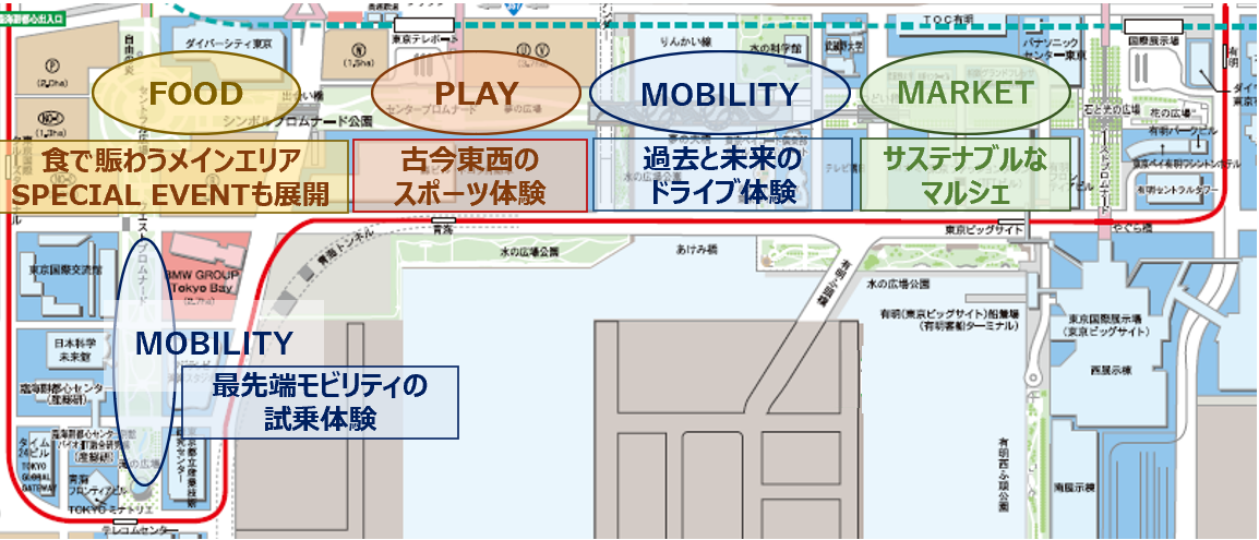 広場に設けたレーンで最先端モビリティが試乗できるほか、広大なエリアを