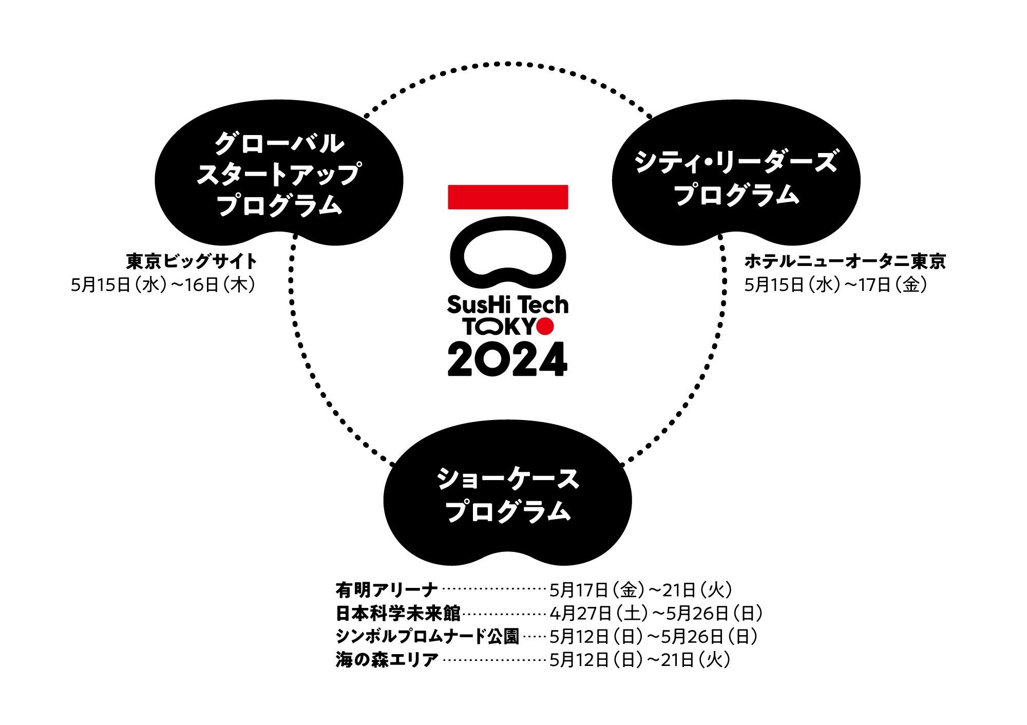 ・「SusHi Tech Tokyo 2024」は来年4~5月に開催する大規模イベント。4万人の参加者を見込むアジア最大規模のカンファレンス「グローバルスタートアッププログラム」、世界5大陸の都市のリーダーが集う首長級会議「シティ・リーダーズプログラム」、未来の都市モデルを「祭」を通じて発信しエリア全体で50万人の参加者を見込む「ショーケースプログラム」で構成される。