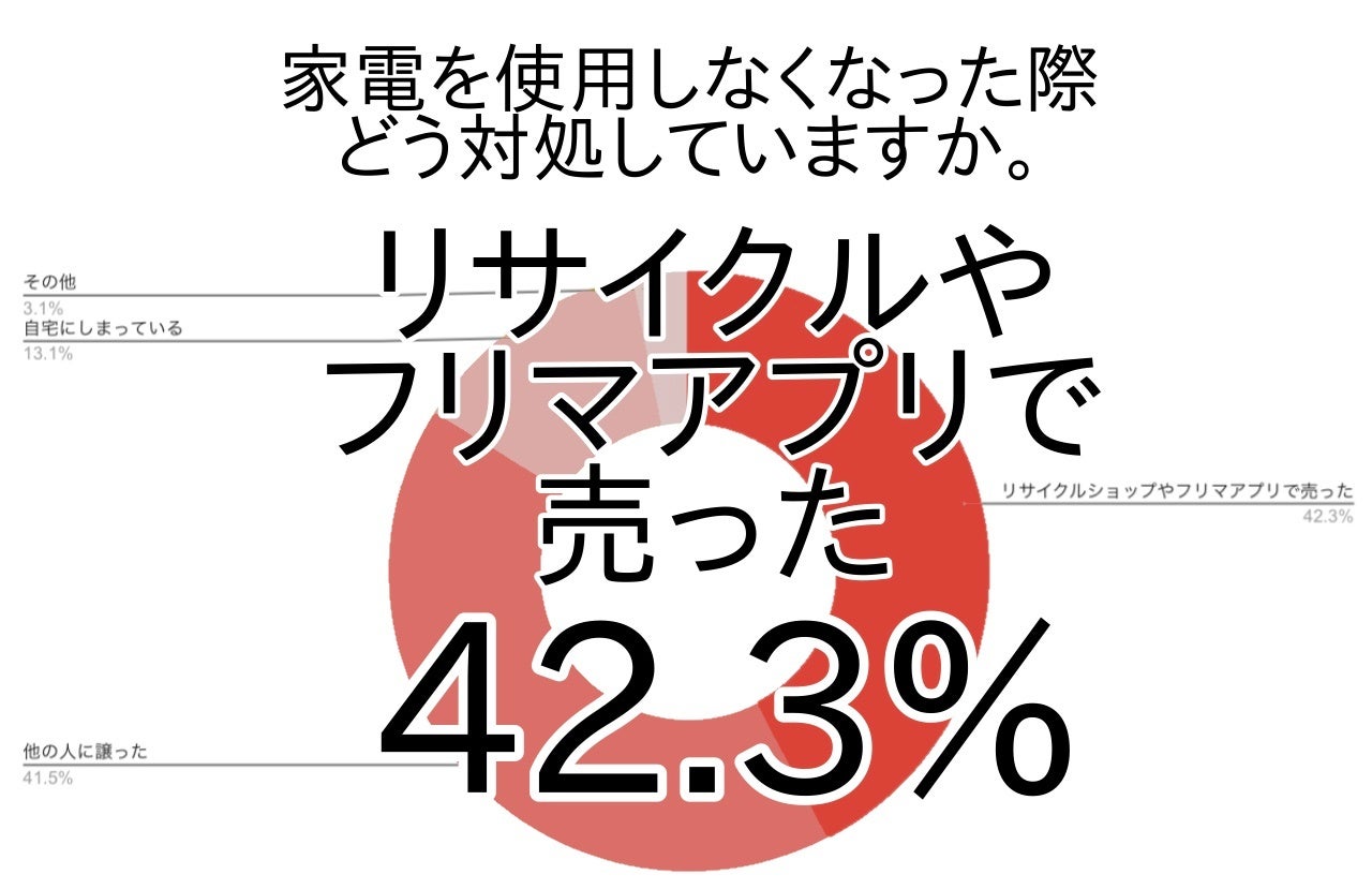 最も多かったのは「リサイクルショップやフリマアプリで売った(関東42.3%・全国38.2%)」でした。ほぼ同率で多かったのは「他の人に譲った(関東41.5%・全国33.7%)」で、まだ使える家電を必要な方に使ってもらう方が多いことが分かりました。まだ使える場合が多いために廃棄処分する方は少なく「その他」に入る少数派でした。
