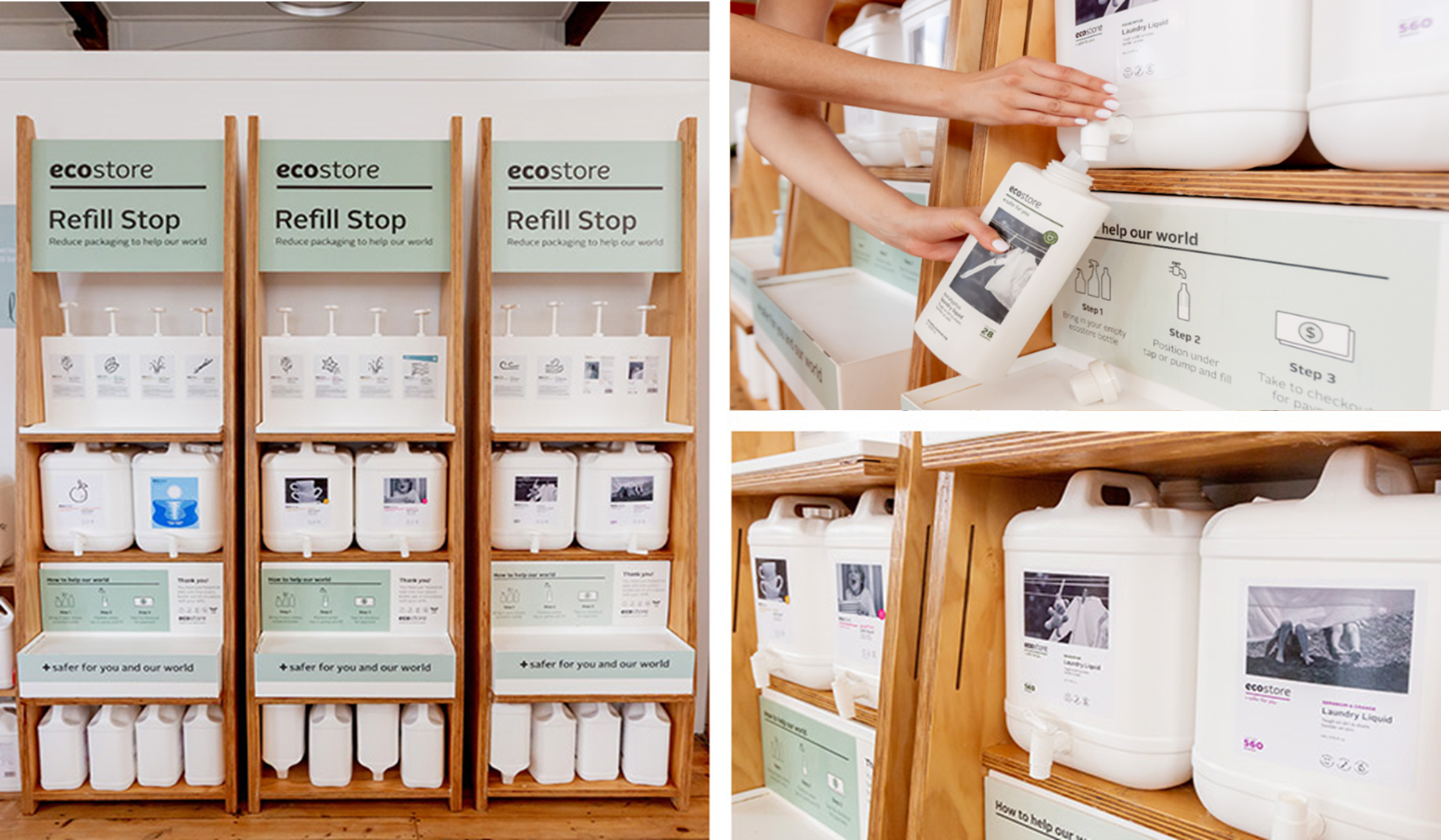 エコストアでは、プラスチックごみの削減を目的としたリフィルステーションを積極的に推進しています。ゴミになってしまう容器の削減をしながら、プライスもよりお得になるという環境にも人々にもやさしい「エコストアならでは」の人気のサービスです。