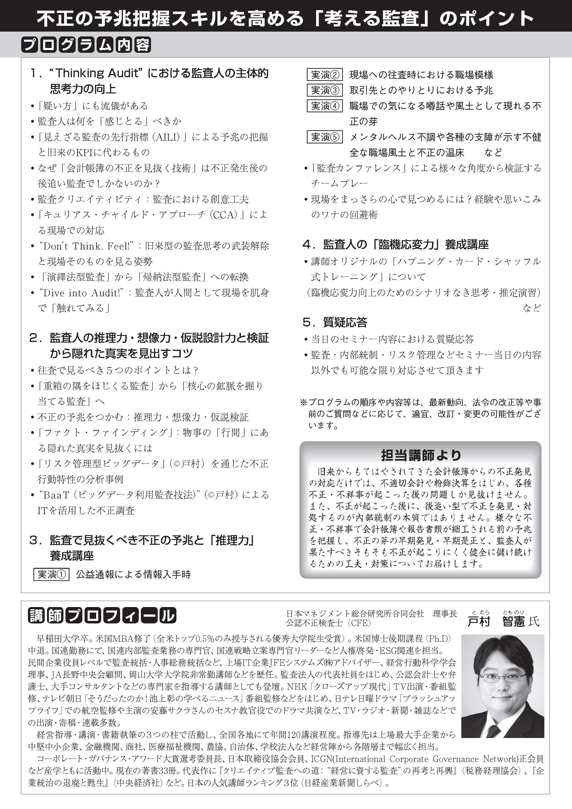 ・セミナー名称: 「不正の予兆把握スキルを高める「考える監査」のポイント ~監査人の職業的懐疑心と監査推理力を通じて「隠れた真実」を見抜く~」