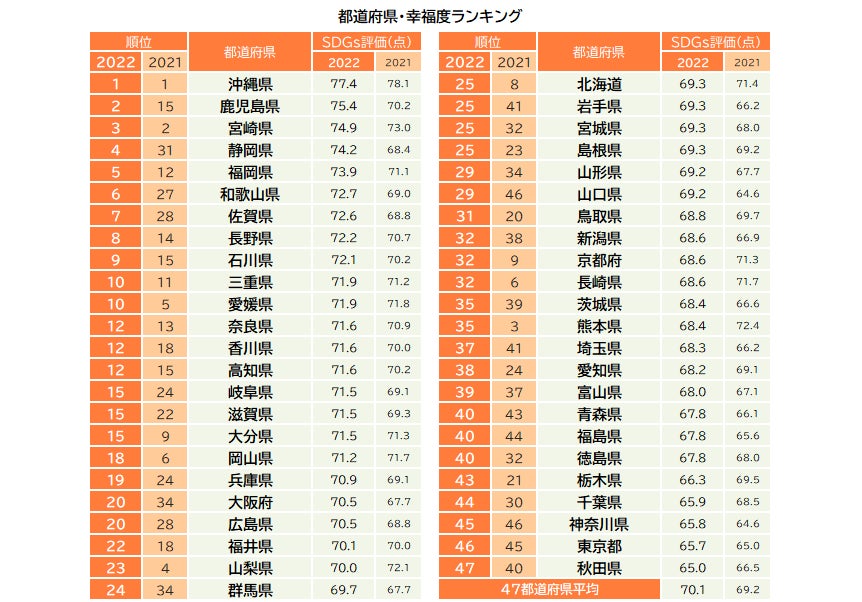 2位は鹿児島県で75.4点と昨年の15位から順位、点数ともに大きく上昇。3位は宮崎県が74.9点でランクインするなど、上位3県のいずれも九州地区が占める結果となりました。