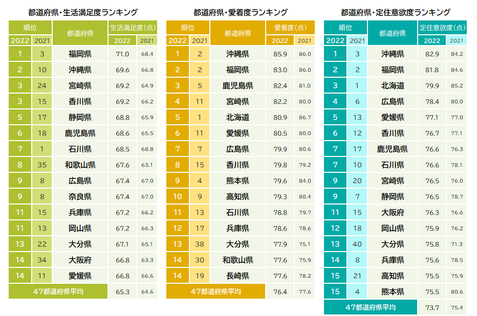 なお、47都道府県平均では幸福度、生活満足度は前年より上昇したが、愛着度と定住意欲度は下降している。その結果、持続度もわずかに下降している。