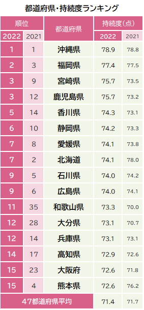 2位は鹿児島県で75.4点と昨年の15位から順位、点数ともに大きく上昇。3位は宮崎県が74.9点でランクインするなど、上位3県のいずれも九州地区が占める結果となりました。
