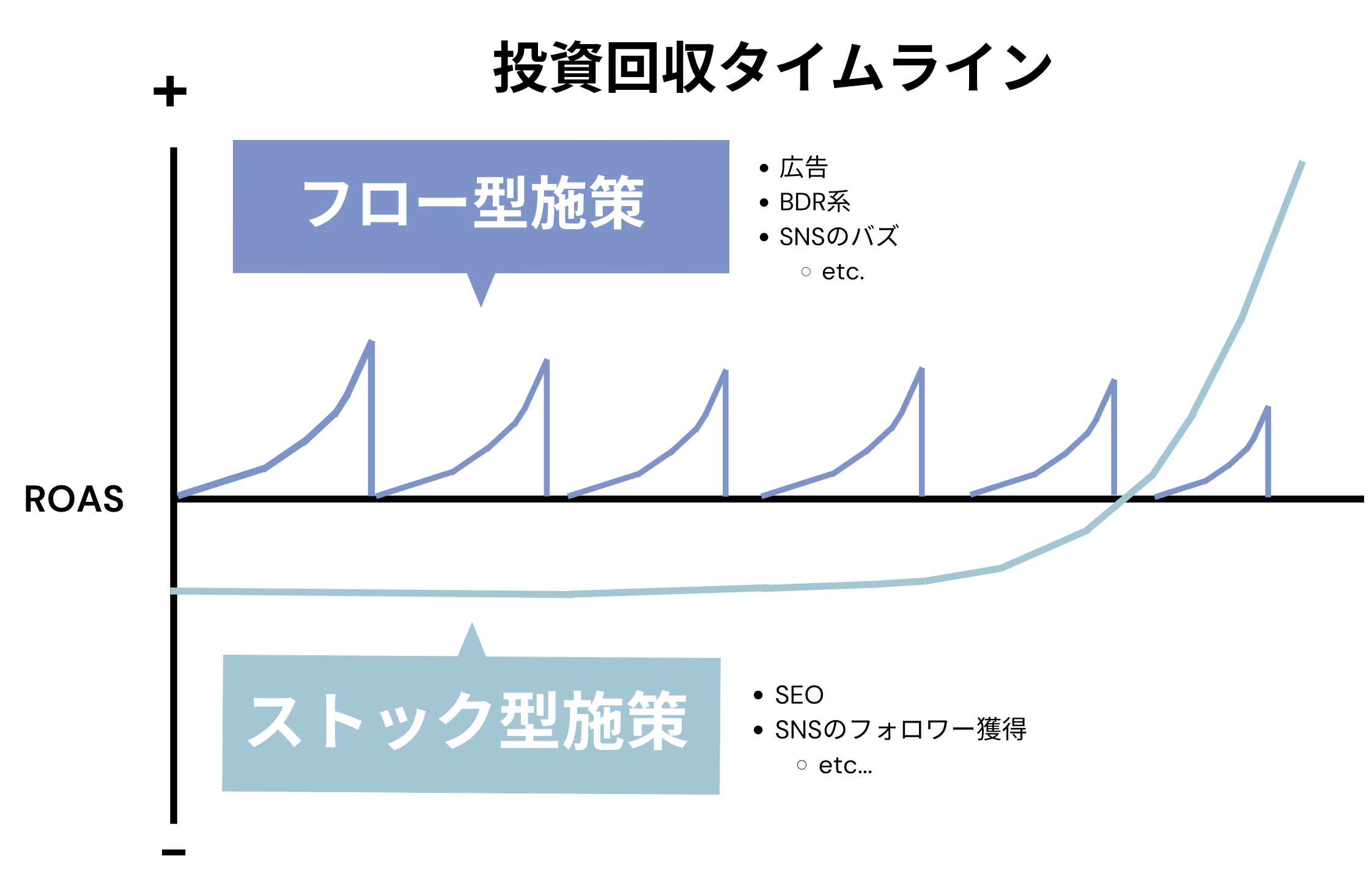 資産化をして長期的に効果が伸びてくる領域の施策です。メリットとしては次のようなものが生まれます。