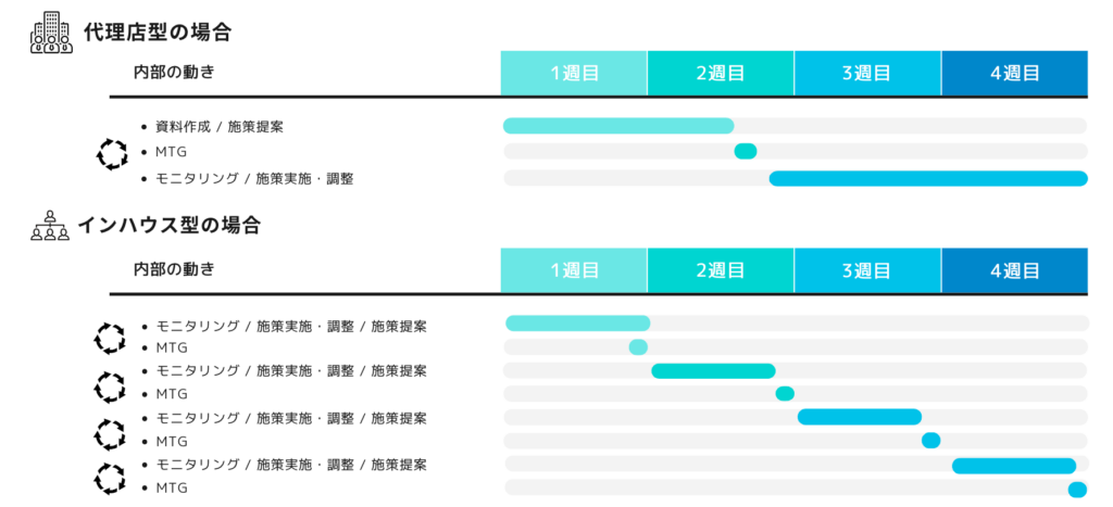 人材エージェントと同じようなコストパフォーマンスで、代理店よりもコスパが優れた状態で、施策提案型の介入が可能です。インハウス化を要とし、コスト最適化、成果逆算した施策、ナレッジや体制を資産化の為に組み上げます。
