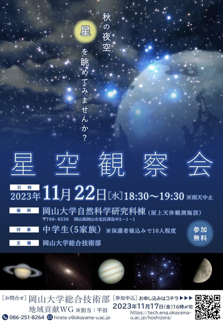 国立大学法人岡山大学(本部:岡山市北区、学長:那須保友)総合技術部による「星空観察会」を、本学津島キャンパスにおいて、2023年11月22日(水)に開催します。
