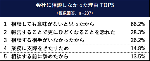 相談できなかった理由…「相談しても意味がないと思ったから」66.2%にのぼる。一方で「相談した方」も、82.5%の方が「(会社は)変わらなかった」と回答