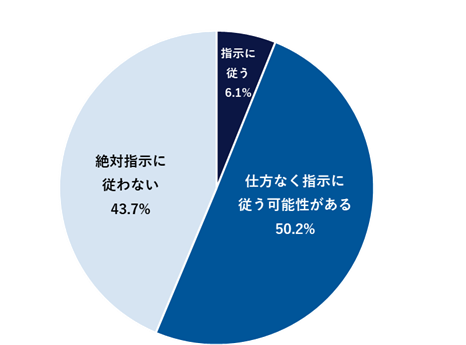 会社に“ブラックなこと”を指示された場合…「指示に従う」6.1%、「仕方なく指示に従う可能性がある」50.2%と、合計して56.3%の方が“仕方なく指示に従う可能性がある”と回答