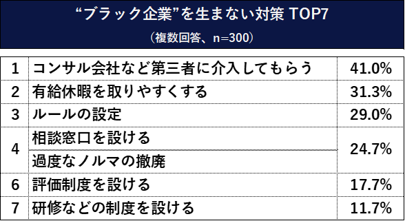 それでは、どうすればブラック企業を生まない体制になるのでしょうか。どのような対策があればブラック企業を生まないと思うかを聞いたところ、「コンサル会社など第三者に介入してもらう」が最も高く41.0%、「有給休暇を取りやすくする」が31.3%、「ルールの設定」29.0%と続きました。「有給休暇を取りやすくする」という働きやすさの改善を内部から行っていくことはもちろんですが、やはりブラック企業を改善するには、コンサルなどの第三者の外部がメスを入れる、そしてそこから明確な「ルールを設定する」ことが求められるようです。