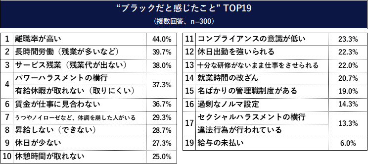 “ブラックだと感じたこと”…「離職率が高い」「長時間労働」「サービス残業」と続く