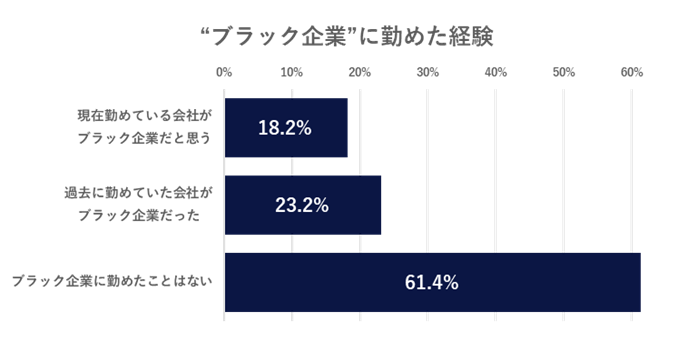※現在・過去に“ブラック企業”に勤めている・いた方は複数回答のため、全体から「ブラック企業に勤めたことはない」61.4%を引いた数値で38.6%となります。