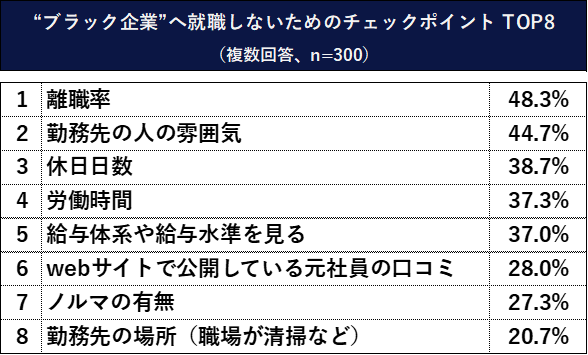 また一方で、ブラック企業へ就職しないようにするには事前に何をチェックすればよいのでしょうか。チェックポイントについて聞いたところ、「離職率」が48.3%と最も高く、「勤務先の人の雰囲気」が44.7%、「休日日数」38.7%、「労働時間」37.3%、「給与体系や給与水準を見る」37.0%、「webサイトで公開している元社員の口コミ」28.0%と続きました。