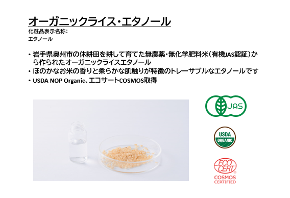 ファーメンステーションでは、有機JAS認証のオーガニック米から、独自の発酵・蒸留技術をもとに、USDAオーガニック認証およびエコサートCOSMOS認証を取得済みのオーガニックライス・エタノールおよびオーガニック米もろみ粕(蒸留粕)をオーガニック原料として製造してまいりました。