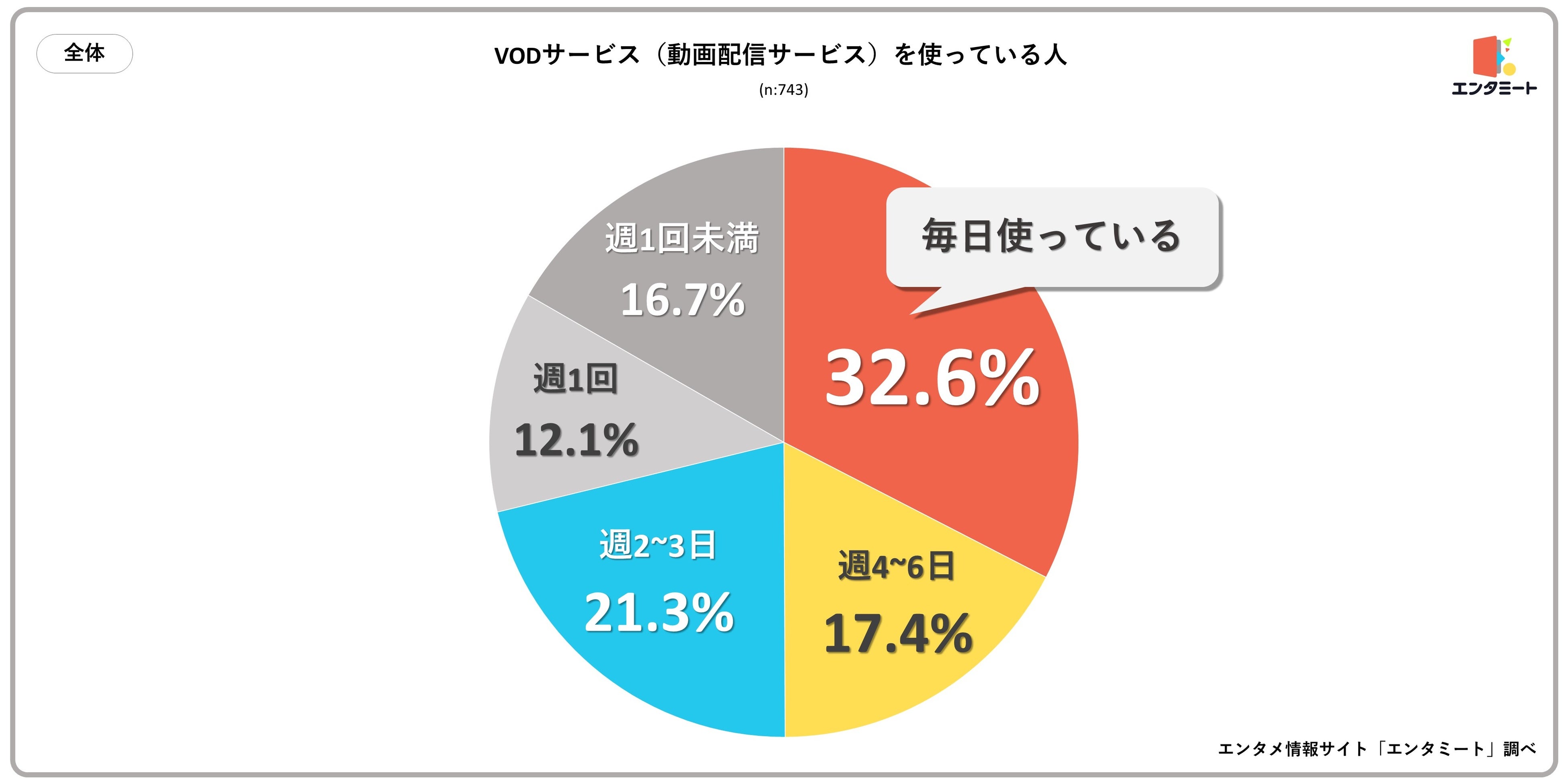 「VODサービスを使う」と回答した人の内、最も多かったのは「毎日使っている」という人で、32.6%となりました。次いで、「週2~3日」が21.3%、「週4~6日」が17.4%と続きました。