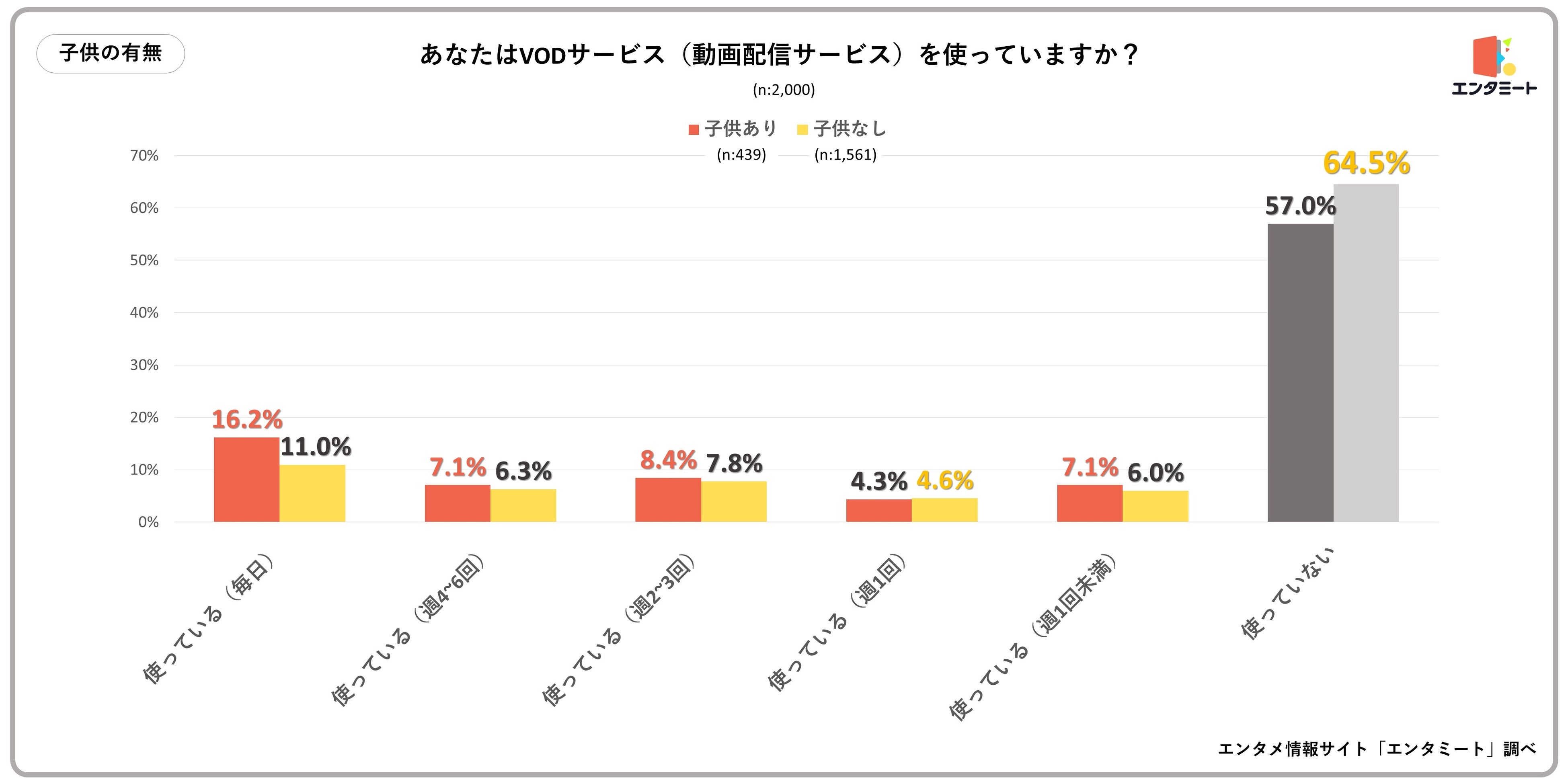 子供の有無で見ると、「子供あり」のVODサービス利用率が7.5%上回り、43.0%となりました。