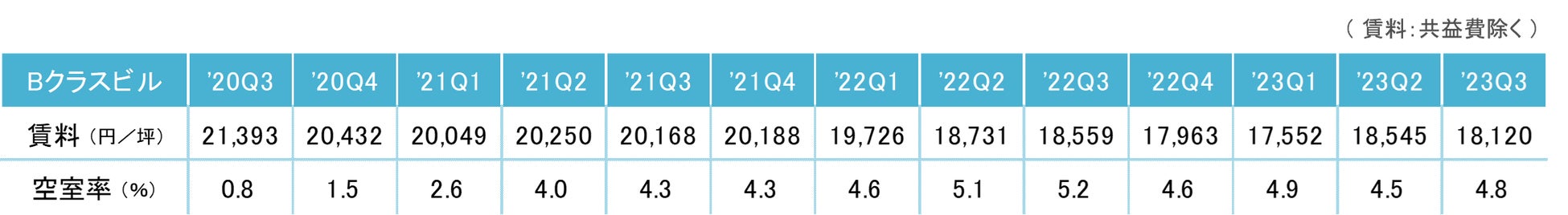2023年第3四半期のBクラスビル賃料は前期比マイナス425円/坪の18,120円/坪(共益費除く)となった。再び下落したものの、2019年第3四半期を直近のピークとした賃料の低下傾向は鈍化しつつある。