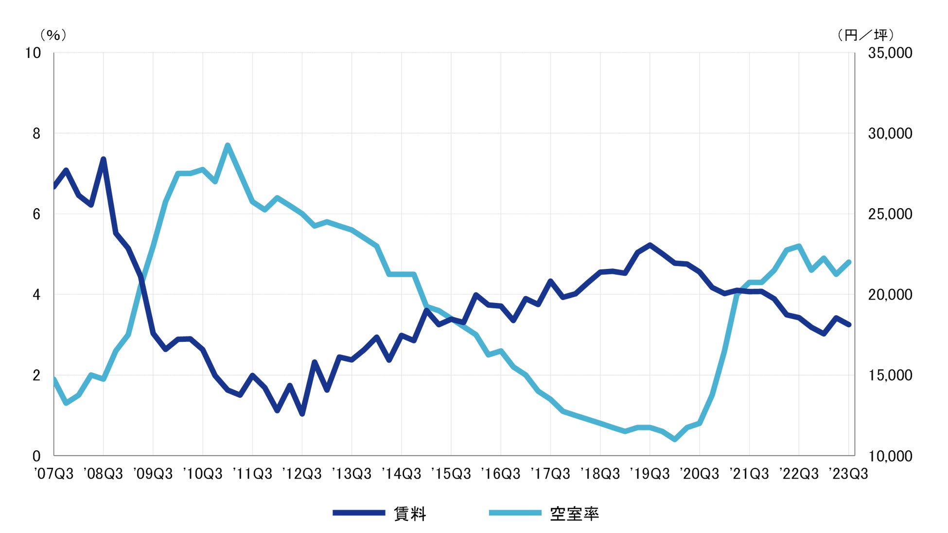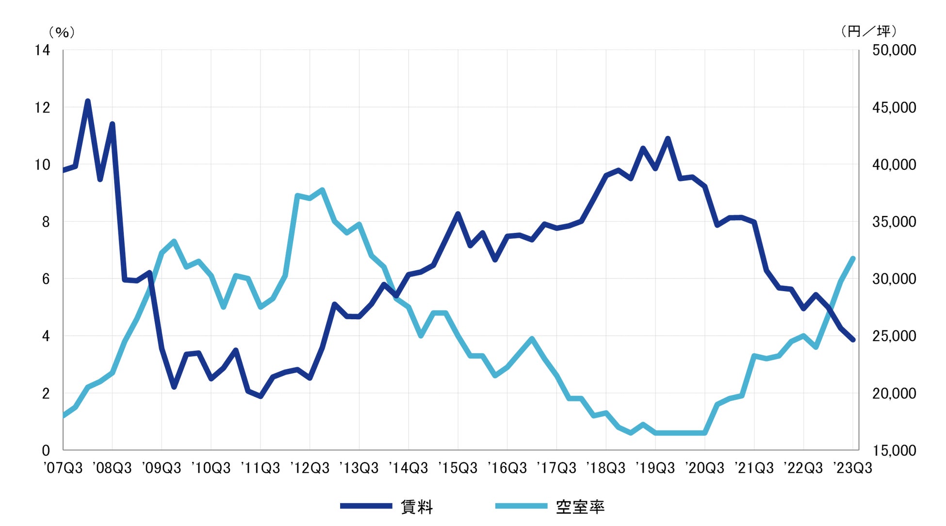 【出所】 賃料:三幸エステート・ニッセイ基礎研究所 空室率:三幸エステート