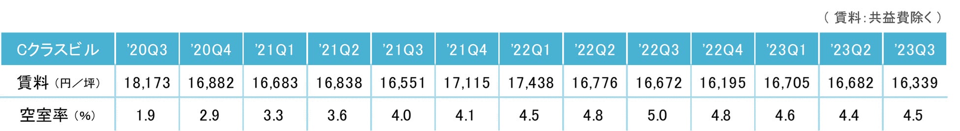 2023年第3四半期のCクラスビル賃料は前期比マイナス343円/坪の16,339円/坪(共益費除く)となった。2期連続で下落したものの小幅な動きであり、賃料は2020年第4四半期以降、横ばい傾向にある。