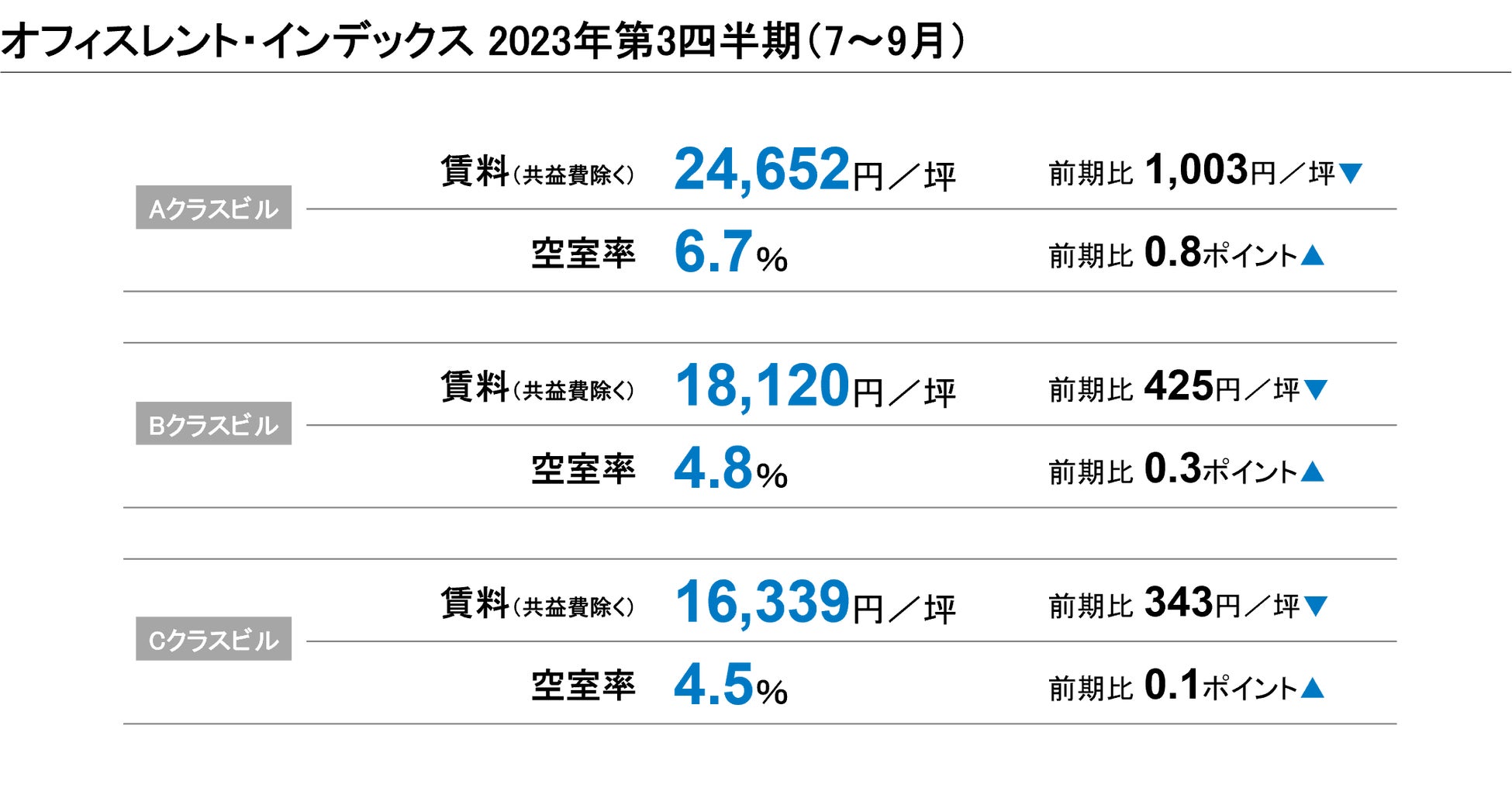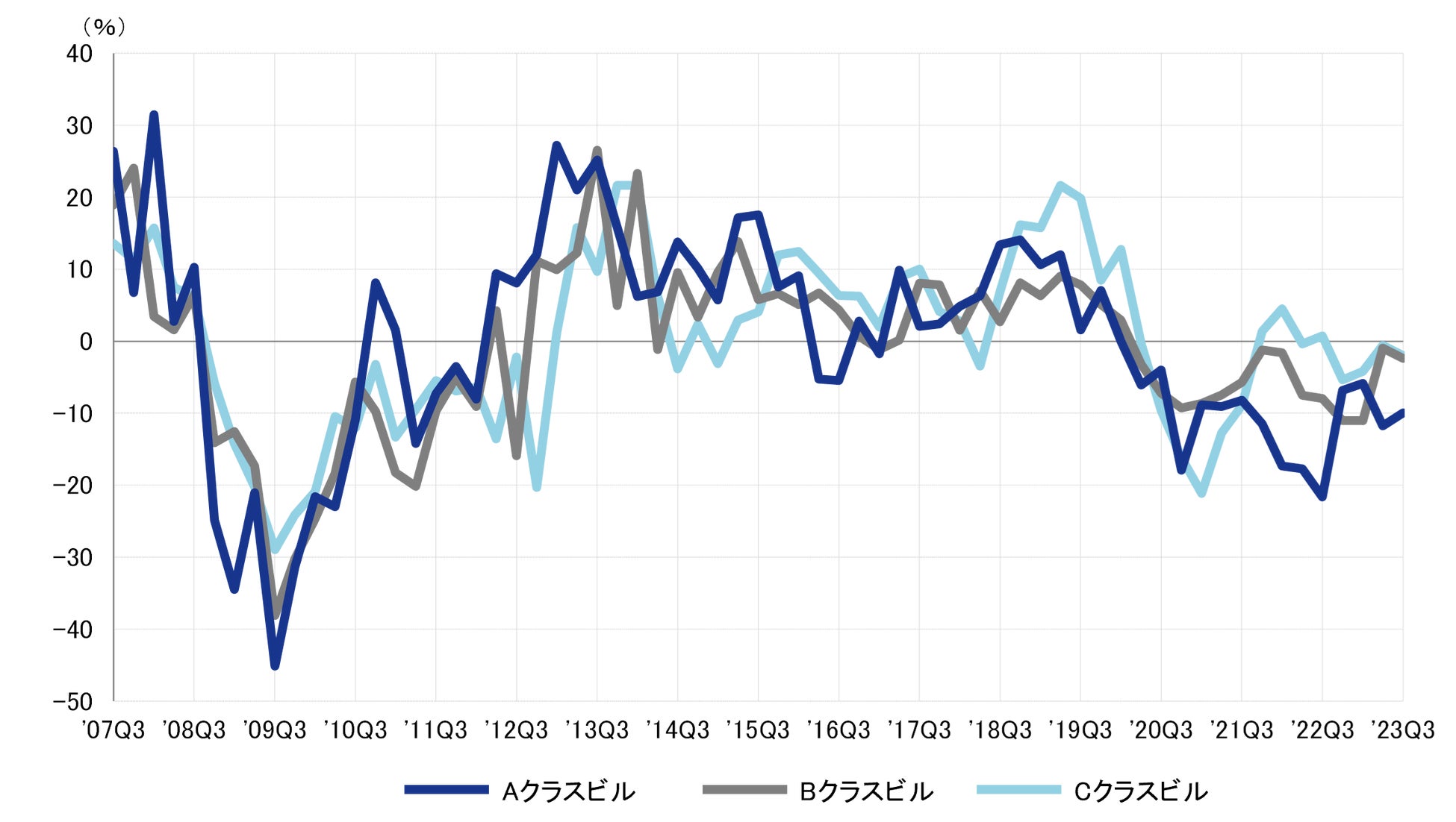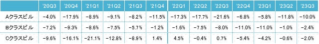 2022年第3四半期との比較による対前年変動率は、Aクラスビルがマイナス10.0%、Bクラスビルがマイナス2.4%、Cクラスビルがマイナス2.0%だった。A・Bクラスビルは14期連続、Cクラスビルも4期連続のマイナスとなっている。 4期連続して全てのクラスで対前年同期比マイナスとなった。