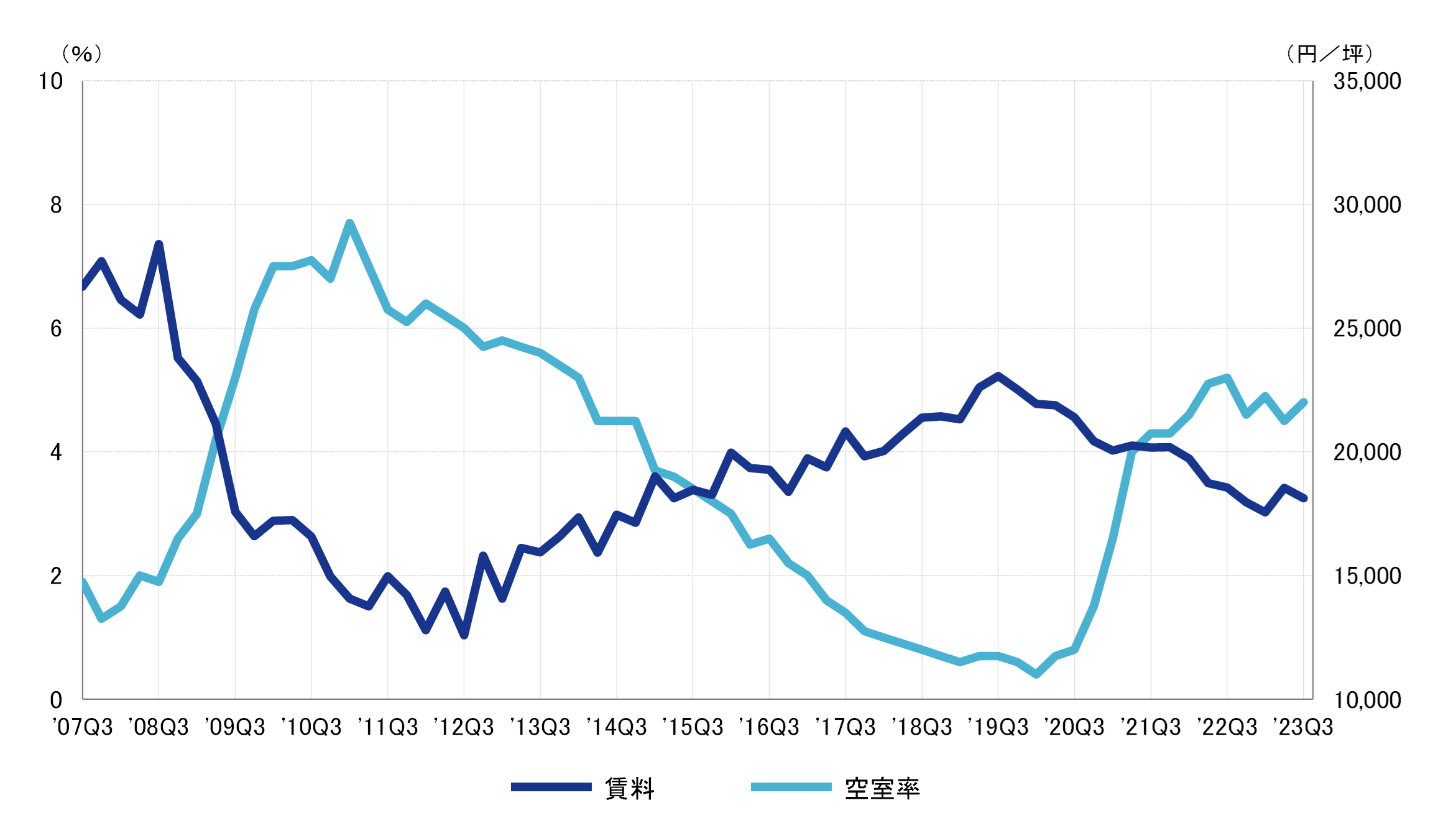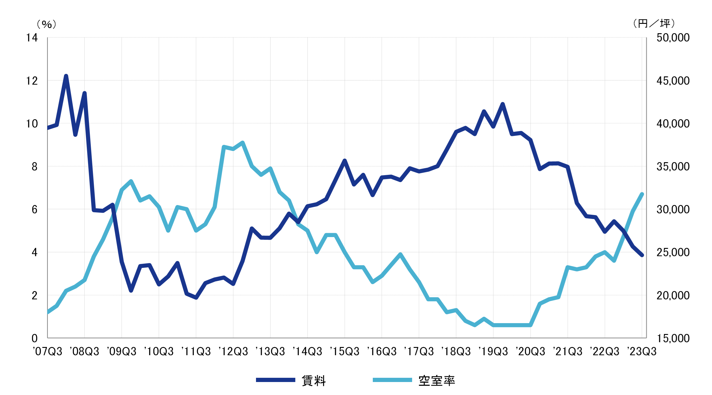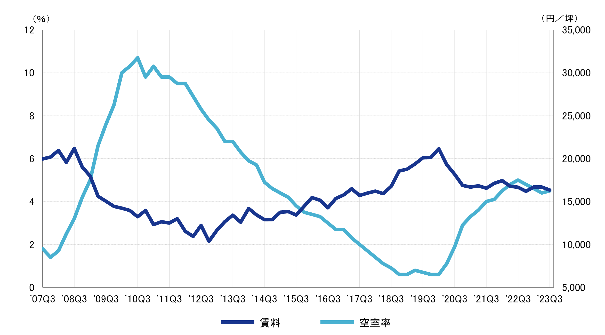 【出所】 賃料:三幸エステート・ニッセイ基礎研究所 空室率:三幸エステート