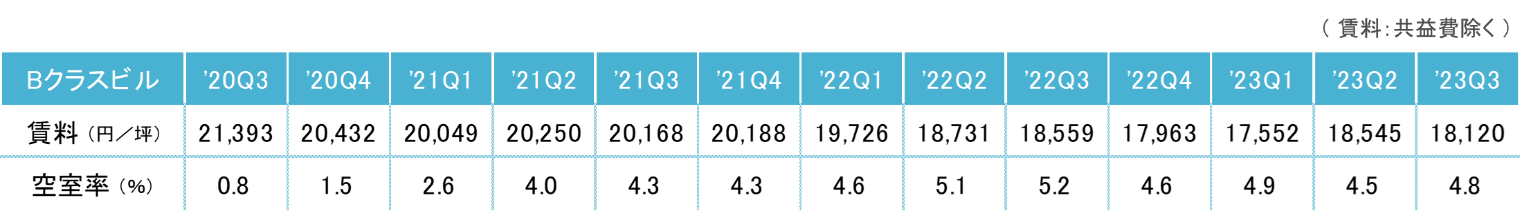 2023年第3四半期のBクラスビル賃料は前期比マイナス425円/坪の18,120円/坪(共益費除く)となった。再び下落したものの、2019年第3四半期を直近のピークとした賃料の低下傾向は鈍化しつつある。