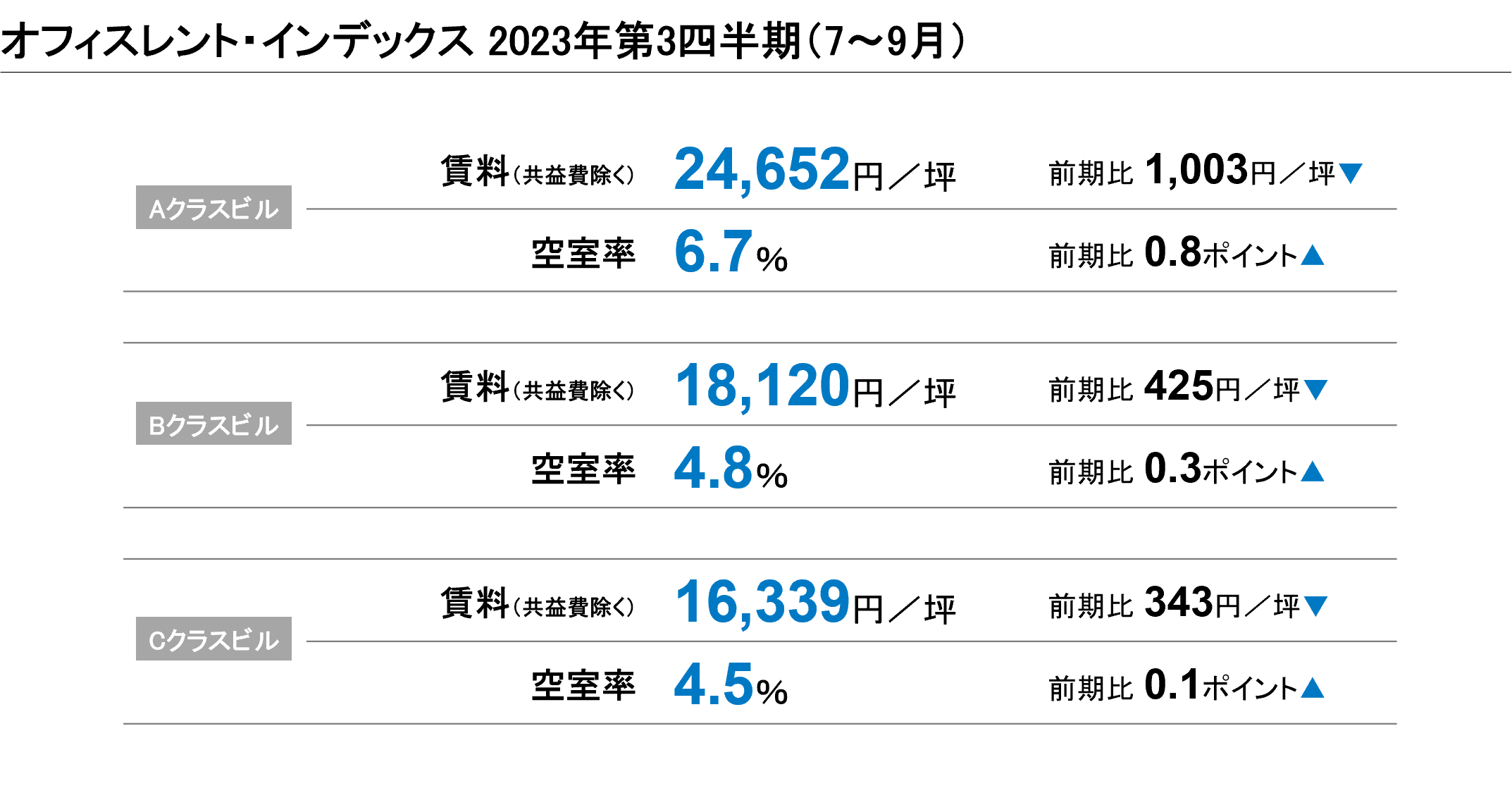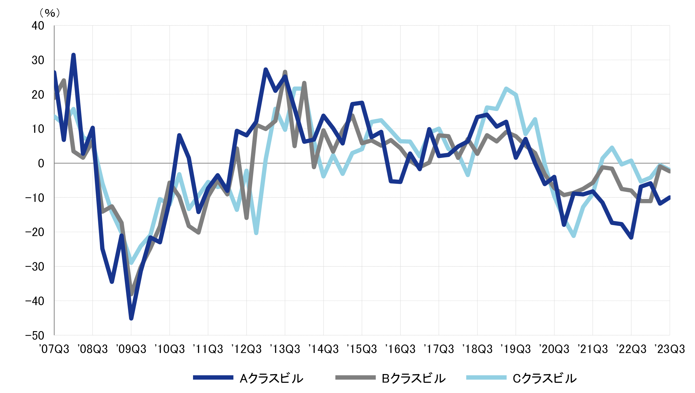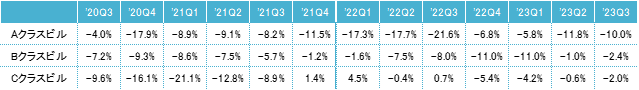 2022年第3四半期との比較による対前年変動率は、Aクラスビルがマイナス10.0%、Bクラスビルがマイナス2.4%、Cクラスビルがマイナス2.0%だった。A・Bクラスビルは14期連続、Cクラスビルも4期連続のマイナスとなっている。 4期連続して全てのクラスで対前年同期比マイナスとなった。