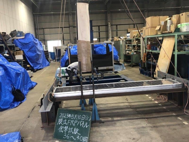 作業員が1.0mの高さから足場上に飛び降りた場合を想定し、重量90㎏の砂袋を400mmの高さから40回自由落下させ、パネルが脱落しないことを確認しました。