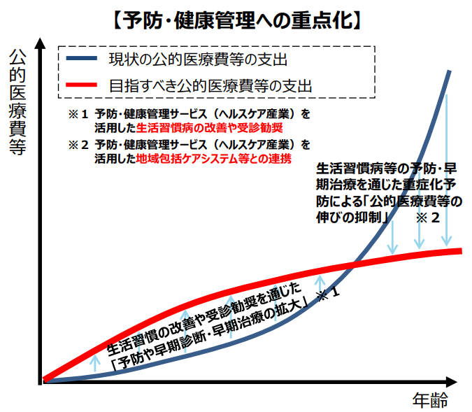 経済産業省は、予防政策によって長生きしながら生涯医療費を削減できるという方針を打ち立てています。2018年に開かれた第7回「次世代ヘルスケア産業協議会」の資料では、「予防・健康管理への重点化」によって、高齢者の医療費が半分以下に減少するという図を示しています。
