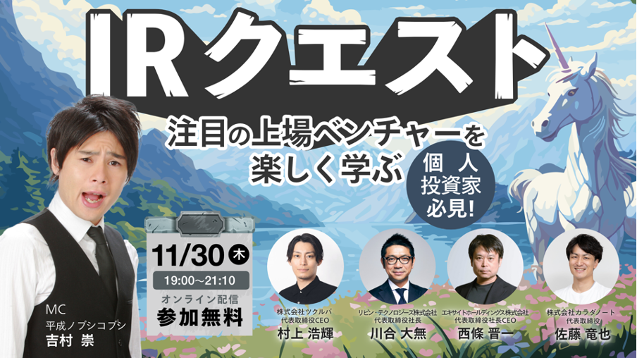 IRクエスト~平成ノブシコブシ吉村と注目上場ベンチャー企業を楽しく学ぶ 個人投資家向け 上場ベンチャー特化のIR説明会。注目の上場ベンチャー企業の経営者が直接登壇! 1社30分程度で成長戦略や自社の強みを直接お伝えします。オンラインイベントなので、スマホや自宅から気軽に参加可能。成長企業の強みを短時間でまとめて知ることのできるこの機会、ぜひご参加ください! |