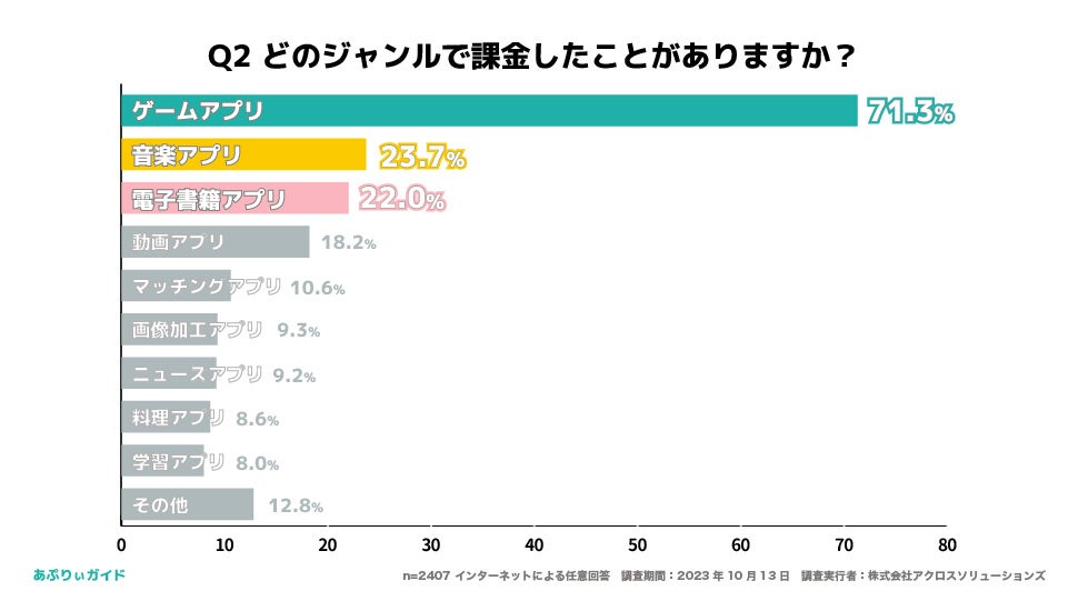 スマホのアプリに課金したことがある人のうち、「ゲームアプリ」と答えた人が71.3%、次いで「音楽アプリ」と答えた人が23.7%、僅差で「電子書籍アプリ」と答えた人が22%という結果になりました。