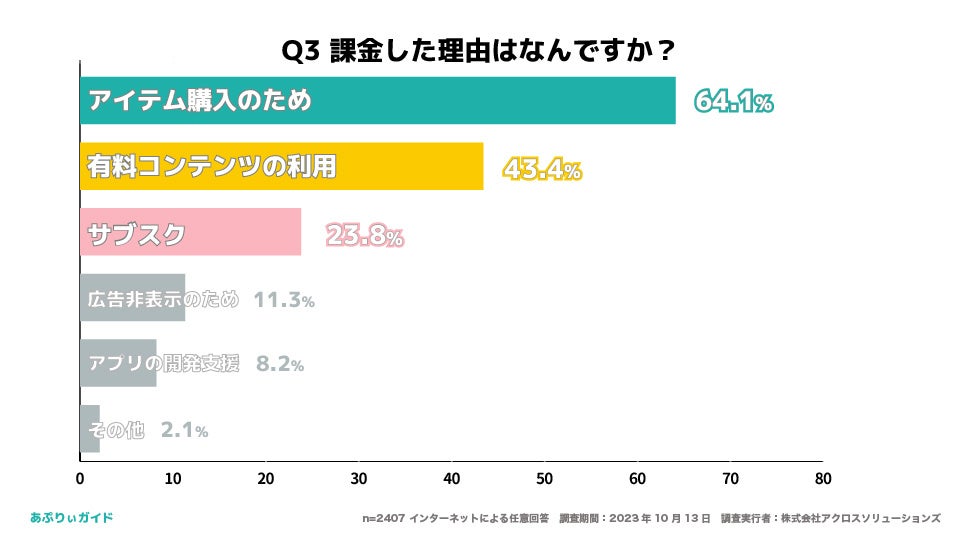 「アイテム購入のため」と答えた人が64.1%、次点で「有料コンテンツの利用」と答えた人が43.4%、「サブスク」と答えた人が23.8%という結果になりました。