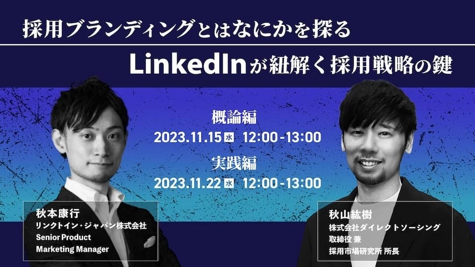 世界最大級のビジネス特化型SNS「LinkedIn」から、人事業界・マーケティング領域のスペシャリストである秋本 康行氏をお呼びし、改めて「採用ブランディング」とはどんなものか、といった概論的な部分から実践的な方法論までを解説します。