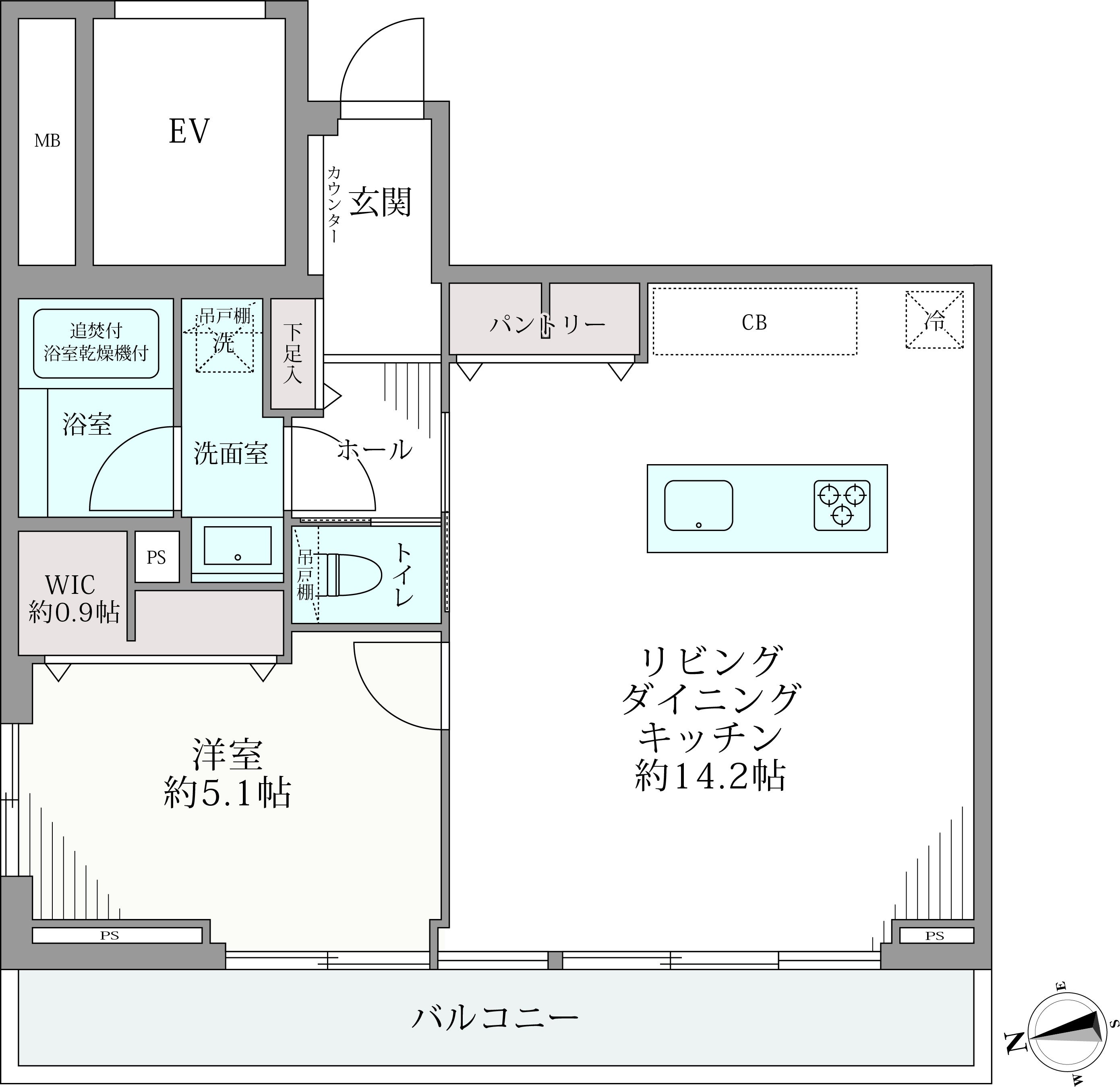 1LDKではありますが、キッチンには大型のパントリー、洋室にはウォークインクローゼット+ワークスペースにも使える空間を設けて、収納力を確保して、多様な使い方にも対応しています。