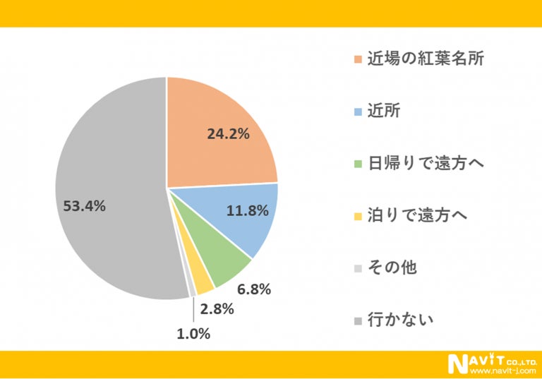 紅葉を見に行く場所については、「近場の紅葉名所」が24.2%、「近所」が11.8%、「日帰りで遠方へ」が6.8%という順になりました。住んでいる場所から近いところで紅葉を楽しむ予定の方が多いようですね。
