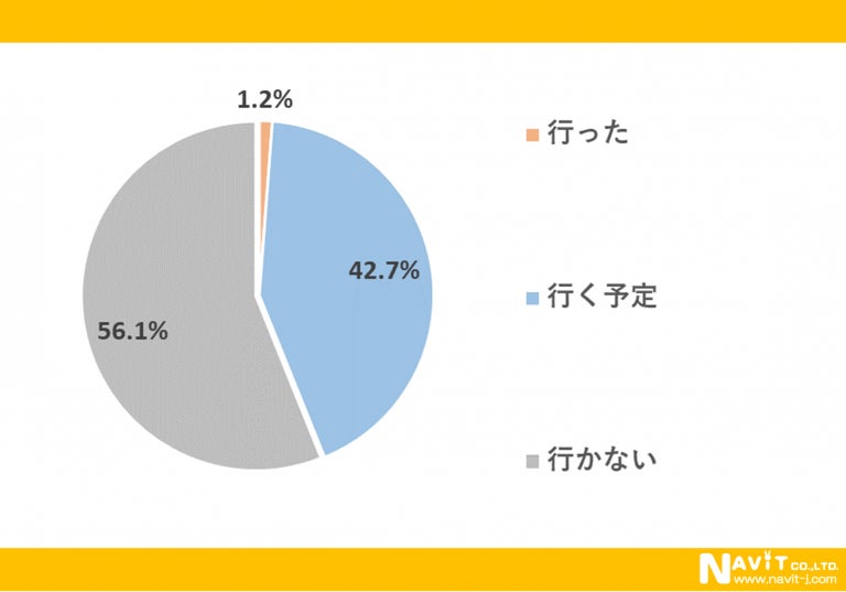 「今年の秋は紅葉を見に行きますか?」という質問に対しては、「行った」が1.2%、「行く予定」が42.7%という結果になり、合わせると43.9%の人が紅葉を見に行った・行く予定だということが分かりました。