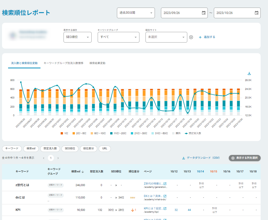 登録済みの注力しているキーワードの日次の動向に加え、サイト全体での想定流入数の推移と検査順位の変動も把握することができ、サイト全体の数値を基にした戦略策定・運用に役立ちます。また、自社のコンテンツ順位の上下から、キーワードグループごとに順位変動を追跡し、競合サイトと比較して重要キーワードの順位勝敗を一目で確認できるなど、キーワードの順位に焦点を当てた様々な調査が可能です。