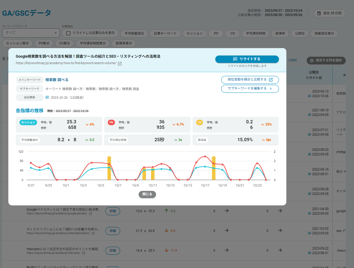 Keywordmapで登録した記事URLとGoogle Analytics/Google Search Consoleデータを組み合わせて、記事ごとのパフォーマンスを実数値で確認できます。順位などの重要指標が下がっているページがある場合ら、すぐにリライト作業へ誘導する導線も用意されており、効果検証~改善施策実行までシームレスな運用が可能です。