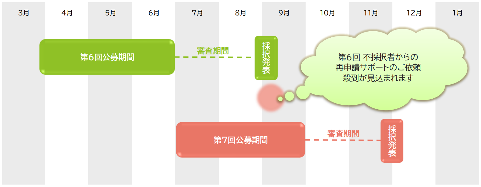この間に[第6回]の採択発表も行われます。発表は8月下旬から9月上旬と予想されています。採択発表後、不採択だった事業者様は再申請をするか否かを検討されます。弊社へも発表直後から、これらの事業者様から再申請サポートのご依頼が殺到する傾向にあります。