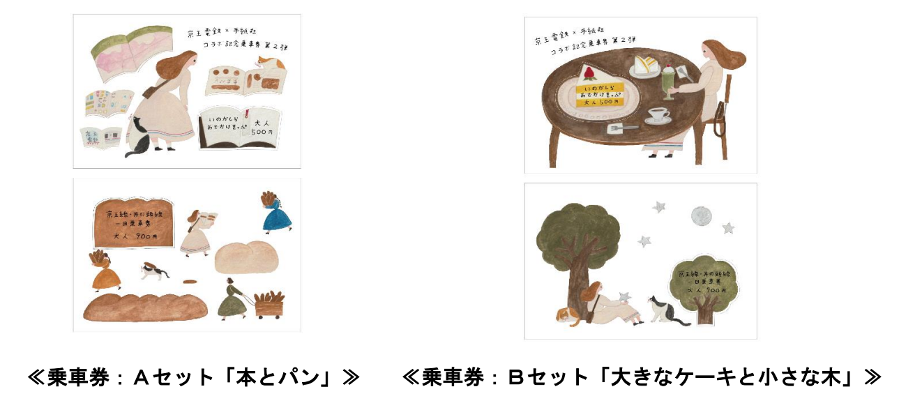 「京王電鉄×手紙社コラボ記念乗車券第2弾」は、手紙社が8月に開催する「紙博 in 東京 vol.5」 のメインビジュアルを手掛けるイラストレーターユニットの「ネクタイ」による描き下ろしデザイ ンです。京王線・井の頭線一日乗車券(大人)900円(税込み)と、いのかしら おでかけきっ ぷ(大人)500円(税込み)がセットになっており、2種類のデザインからお選びいただけます。 「紙博 in 東京 vol.5」で先行発売するほか、手紙社の店舗やWebサイト、啓文堂書店の一部店 舗でも販売を行います。